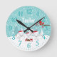 This cute and fun clock can be personalized with a name. It features an adorable arctic fox family in a winter wonderland setting with snow capped trees and a red bird on a branch with holly. The foxes in Santa hats add a festive touch. In the background is a teal blue green sky and falling snowflakes