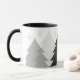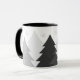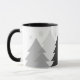 This ceramic coffee mug is shown in a refreshing image of woodlands fir tree print. Snowflakes grace the mug cascading down from the rim.