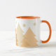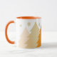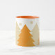 This ceramic coffee mug is shown in a refreshing image of woodlands fir tree print. Snowflakes gracefully descending from rim,