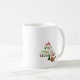 A red, white and green, very merry Christmas tree with a bird in a Santa hat looking on.