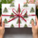This Christmas wrapping paper features a lovely watercolor illustration of a pine tree, that has simple and elegant red decorations. It creates a modern, minimalist pattern in a light pink background.