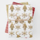 This wrapping paper sheets set is shown in a festive Christmas holiday colours of muted burgundy, white and gold-tone colours, Prints of snowflakes, Christmas trees and reindeer on one sheet; Burgundy and gold-tone stripes on another. The third sheet is white snowflake images on gold-tone paper.