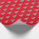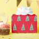 Holiday gift wrapping paper shown in a red background colour with a festive Christmas tree print.