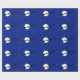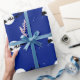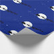 Christmas wrapping paper with Santa in his sleigh with reindeer in silhouette surrounded by many stars and a full moon against a blue background at night.