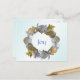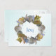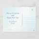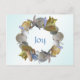 Tropical themed seashell wreath Christmas holiday greeting postcard. Affordable holiday card with customizable text with a message and signature on the back. Light blue background and pretty beach shells surrounding the text 'joy' on front.