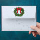 Decorated Christmas linen envelopes with a place for the return address on the front. Snowflakes in light blue cover the outside and a pretty green wreath with a red bow decorates the flap. The snowflake design carries to the inside.