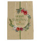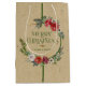 Colourful Christmas floral wreath, modern typography-Merry Christmas-, and beige cardboard paper texture background. Dark-red and green accent.