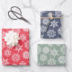 Modern Christmas snowflake pattern adorn this lovely trio of coordinating gift wrap. Traditional red, blue and green colorways with assorted snowflake shapes.