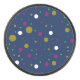 A pattern of variously sized circles in gold, white, purple, and green is scattered across a dark blue background. The circles are evenly spaced and vary in diameter.