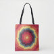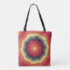 This image is a vibrant, abstract spiral design featuring jagged, concentric rings in bold colours like red, orange, yellow, teal, and maroon. The visual pattern creates a hypnotic, kaleidoscopic effect, drawing the eye toward the centre where a starburst shape radiates outward. The overall appearance is reminiscent of a retro psychedelic style, blending both geometric and organic elements for a mesmerizing and energetic look.