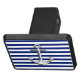 A modern nautical silver chrome like anchor applique style on a navy blue stripes decor for a custom gift everyone on, or off the boat will enjoy.