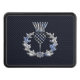 A silver chrome like Scottish thistle applique design on a racy navy blue carbon fibre style print background.