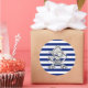 A silver chrome like pirate design on a navy blue stripes decor. A modern nautical gift.