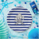 A silver chrome like pirate design on a navy blue stripes decor. A modern nautical gift.
