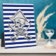 A silver chrome like pirate design on a navy blue stripes decor. A modern nautical gift.