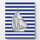 A silver chrome like regatta sail boat design on a navy blue stripes decor. A modern nautical sailboat gift.