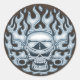 Our Chromeboy biker skull with crossed wrenches and cold flames. Ink with digital colour, t-shirts & gift swag.