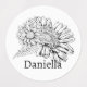 Black on white line art drawing of two Chrysanthemum flowers with a sprig of fern and a personalized name. This is original hand drawn art from Dogwood & Thistle Art and Design.
