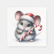 A cute fluffy mouse wears a Santa hat and holds a large striped candy cane