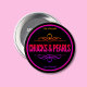 Chucks & Pearls Vote Kamala Black Round Button. Pinks, purples, orange's. Pretty and right to the point.