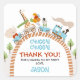 Modern boy's chugga chugga train birthday thank you sticker featuring a mostly blue train with safari animals, hills and rail tracks.