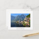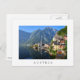 Photo postcard of a landscape with the church and the houses of the small village of Hallstatt in Austria, with reflection in the still water of Hallstatt lake and in the background the Alps mountains on a beautiful clear sky summer day with a white border and the text 'Austria'.