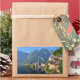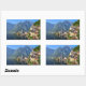 Photo sticker with a landscape with the church and the houses of the small village of Hallstatt in Austria, with reflection in the still water of Hallstatt lake and in the background the Alps mountains on a beautiful clear sky summer day.