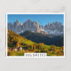 Photo postcard of the small village Sankt Magdalena with the prominent church surrounded by trees in autumn colours in front of high Dolomites mountain peaks in the last light of the day in the Villnöss (Funes) valley in South Tyrol, Italy with a white edge and the text 'Dolomites'.