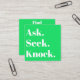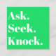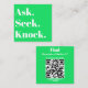 A unique green and white square business card, designed to make a lasting impression. This minimalistic card features a bright green and white colour scheme, perfectly complemented by an elegant serif typeface inspired by 19th-century European advertising posters. The front of the card boldly displays the powerful words, Ask. Seek. Knock. while the back encourages the recipient to find the promise of Matthew 7:7. With a customizable QR code, you have the opportunity to personalize a call to action above and below the code, making it ideal for promotional use for a sermon series or as a personal business card. Whether you're a minister or member of a church seeking to spread the message or an individual with a religious inclination, this card is a perfect fit. Share your faith and scripture in a stylish and impactful way. Embrace the power of this Christian-inspired business card today.