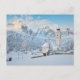 Photo postcard of the church of Colfosco covered in snow with in the background the Sella Group Dolomites mountains in a beautiful winter landscape in Alta Badia, South Tyrol, Italy.