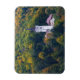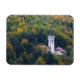 Rectangular photo magnet with a church surrounded by trees in a forest in fall colours on the hills around Bled Lake in Slovenia in autumn.