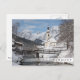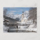 Photo postcard of a church under a layer of snow next to a mountain stream and a bridge with Alps mountains in the background in a winter landscape in Ramsau bei Berchtesgaden in the Berchtesgadener Land in Bavaria, southern Germany, near the border with Austria with a fading white bar and the text 'Germany'.