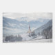 Rectangular photo sticker with the church of St. Pankraz in an alpine landscape in the snow surrounded by clouds and fog on a hill with a view over Zillertal valley with the Alps mountains in the background in Fügen, Austria in winter.