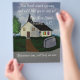 Digital drawing of a small country church, clear blue sky, a tree on green lawn landscape.