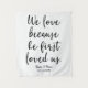 We love because he first loved us church wedding backdrop banner decorations with bride and groom names and the date. Design in black and white with religious sayings. Also great for a wedding party, ceremony, as aisle decor, wedding table decorations, wedding shower, and more. Use it to hang it on a wall, arch, or photography stand.