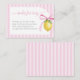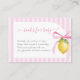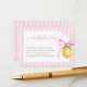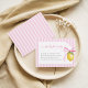 A coordinating insert card inviting guests to bring a favorite book instead of a card, featuring pink stripes and delicate lemon artwork.