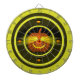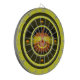 Le design est composé d'un citrouille orange qui semble briller dans le noir. Une bougie éclaire les yeux et un sourire. Une ombre sombre est visible derrière et sur les côtés du citrouille. Un dossier noir avec une bordure jaune a été ajouté à la conception. Un grand atout pour ceux qui ont une fête. Cette carte de fléchettes peut être faite sur mesure avec tout ce que vous voulez.