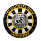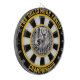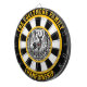 Design circulaire présentant un cerf aux bois dans une forêt tranquille, encadré d'une cible.
