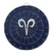 A silver chromlike aries zodiac symbole on a navy blue carbon fiber design texture background. A modern urban racy design for a great custom birthday vend idea. Use the link to contact us with your special design requests or for some assistance with your customization project.
