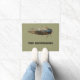 Welcome guests or maybe scare them away with this doormat that features a giant photo of a cicada with red eyes. Below the bug is a space to add a name or other message in bold black lettering. The photo and text are set against an olive green coloured background.