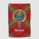 Clan Morrison badge crête entouré d'une courroie et boucle sur l'arrière - plan tartan rouge. Texte personnalisé.
