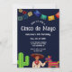 Festive holiday invitation for Cinco de Mayo or any Mexican-themed Birthday Party event with gold border with a floral Mexican folk pattern on the front with a moustache .