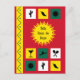 The design of this card is inspired by the joys of Mexico. The colours are green, red and white for the Mexican flag, with the addition of a bright sunshine yellow. "Feliz Cinco de Mayo" = "Happy Fifth of May". The background is red, with a sunburst in the middle and a zig-zag patterned stripe on the left hand side. The pattern of nine coloured squares contains Mexican-themed icons in silhouette: cactus, chili, sun, cocktail glass, sombrero and maracas.
