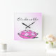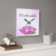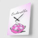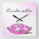 A custom wall clock fit for a princess with a script font and Cinderella's glass slipper on a pillow in light and dark pink, antique art restored from a vintage drawing in a fairytale storybook. Click Customize It to change fonts, background colours and more.