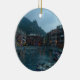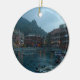 This ornament features a photograph of a beautiful little harbour in Cinque Terre, Italy at dusk. The boats have come in for the evening and the street lamps have been turned on, illuminating the pink and yellow buildings. The sea in the foreground and mountains in the background have become dark, while the still blue sky is growing dim.