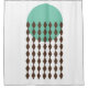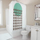 This shower curtain has a mid-century modern design with a sea-green circle with brown diamond chains.
