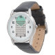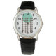 This men's watch has a mid-century modern design with a sea-green circle with brown diamond chains.