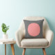 A pillow with a minimal abstract circle design in soft pink on 60% grey.