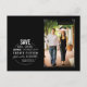 Announce your special day with this simple, modern black save the date postcard featuring a circle with white text and a photo in grey photo corners. No need to crop your photo, just slip it in behind the black background and you are good to go. The photo corners and black background are removable. Custom colour schemes are available upon request.