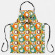 This apron has a mid-century modern design of circles and semi-circles in orange, yellow, green, brown, and turquoise on a field of white. If you want the same design with different colours, message me.